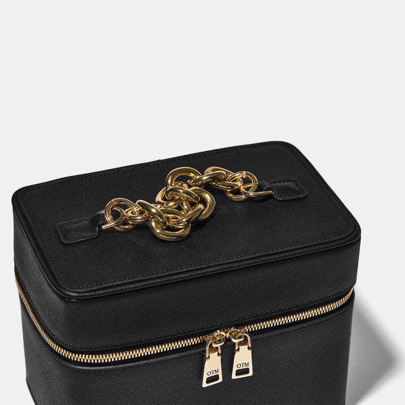 “This chic cosmetic case is more than just a vessel for transporting your beauty products across the globe; it’s a conversation piece. Featuring intricately etched gold hardware, and a sleek gilded chain handle, this is a piece you’ll want to show off, not hide in a suitcase."